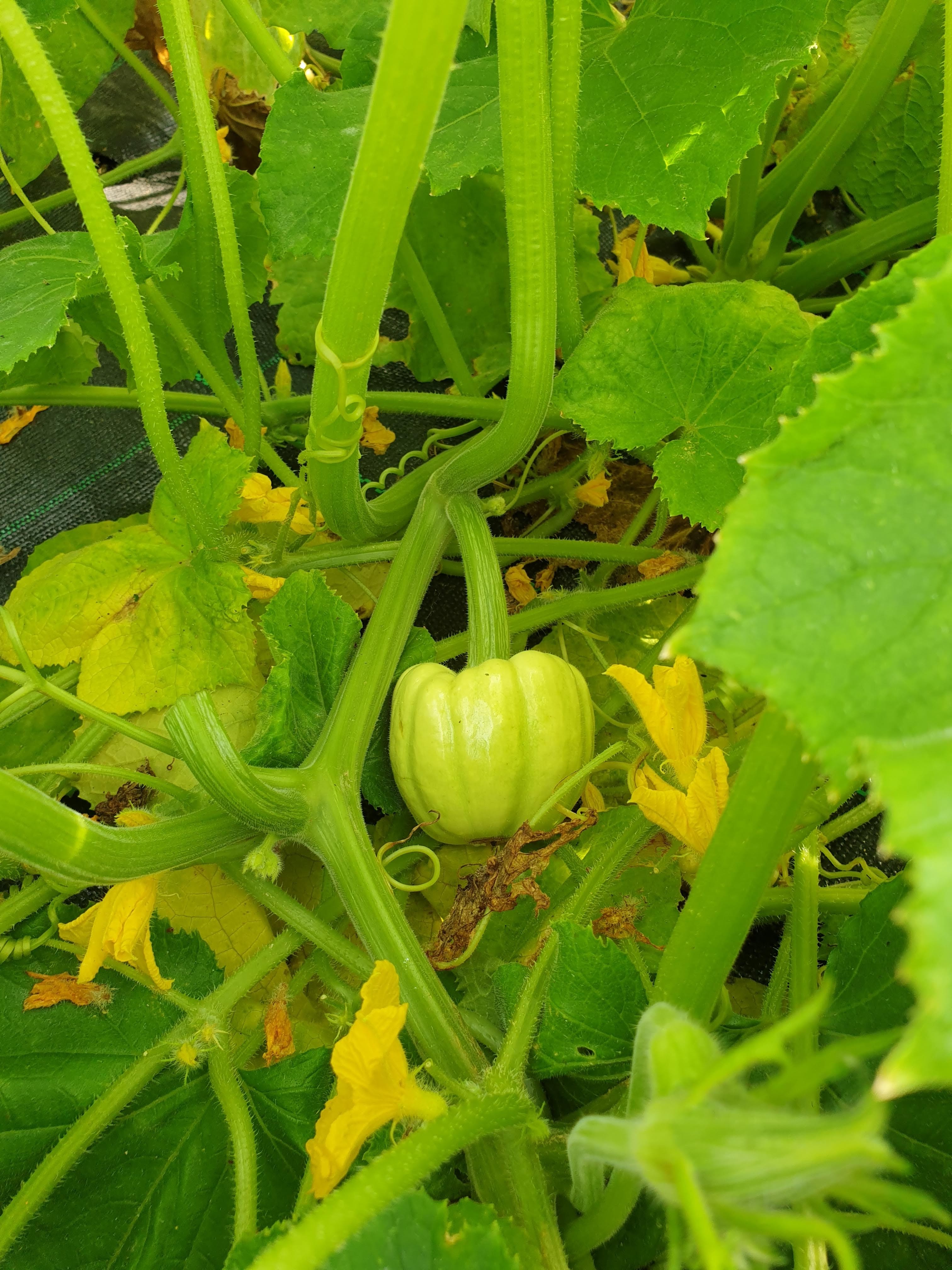 キュウリとパティソンとズッキーニの間に生えているこの子は誰?今年は色んな種類のタネを蒔いてみたけど、この子が誰か忘れたわ。見た目はカボチャっぽいけど、つるが伸びててキュウリみたいな感じ。でも食べてみるとズッキーニっぽい。不思議な子や。