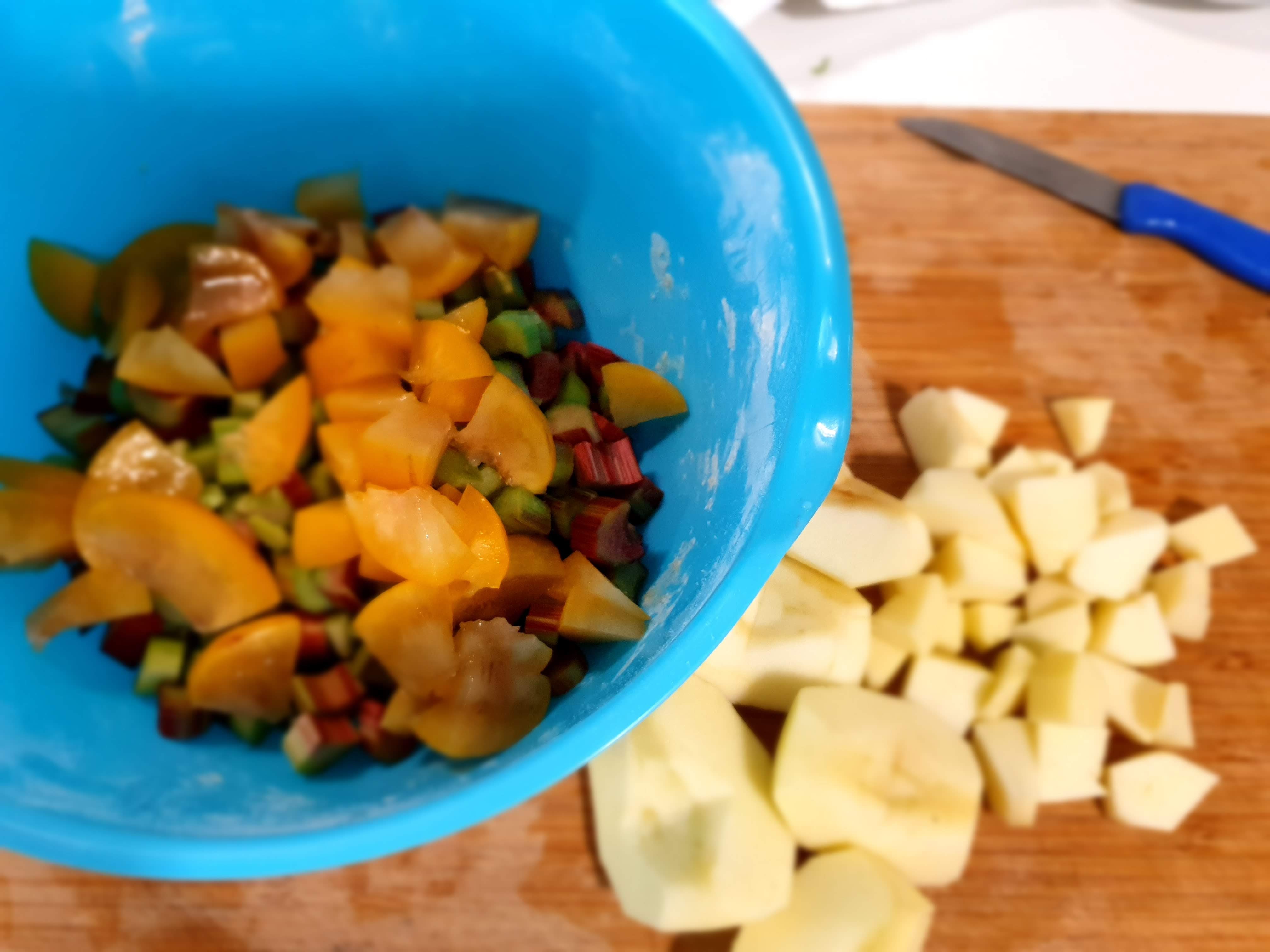 - まずはルバーブを綺麗に洗います。綺麗に洗ったら上の写真の様に約1㎝幅くらいに切ります。リンゴも同様のサイズくらいに切ります。