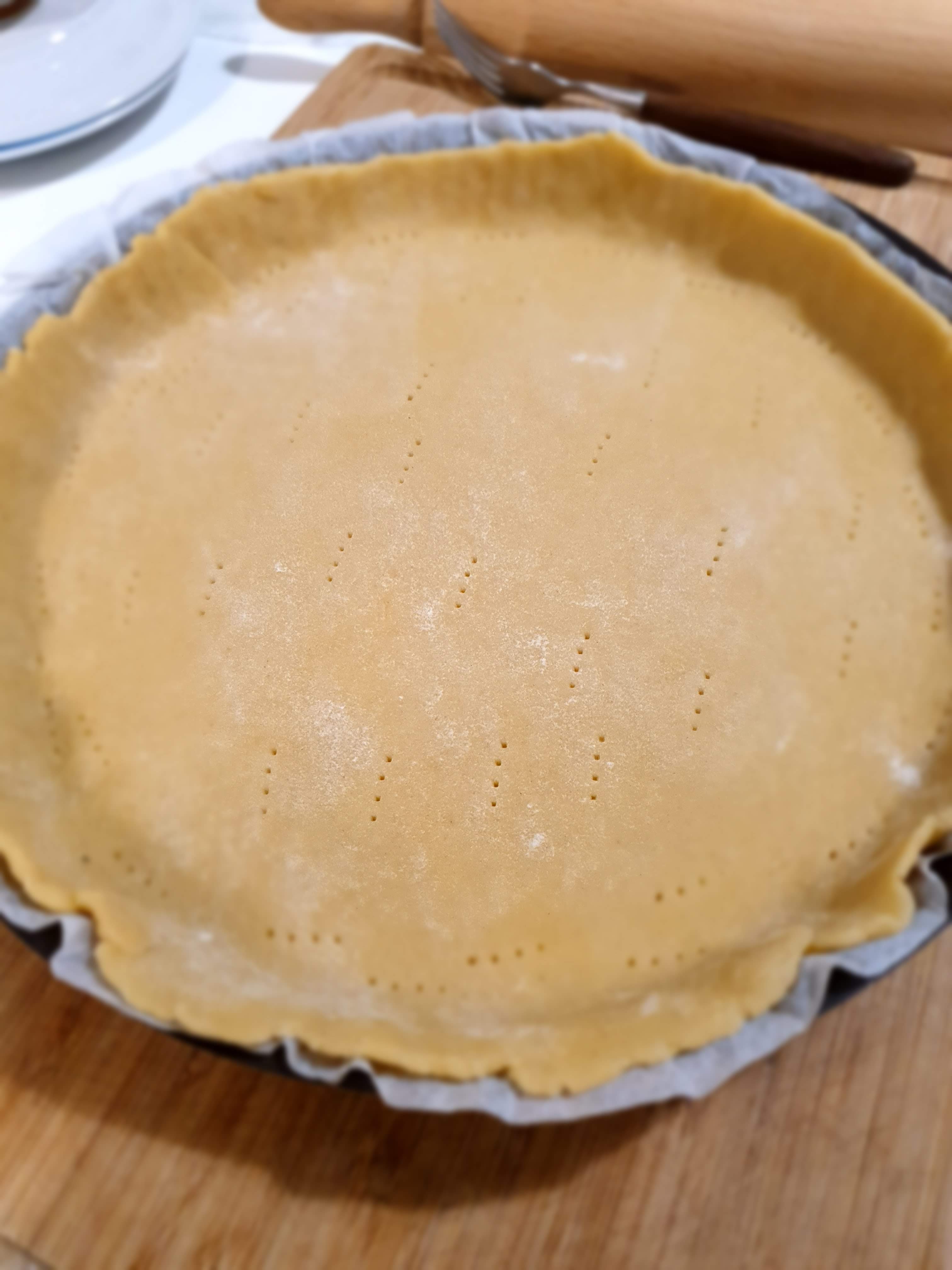 - この間に生地を冷蔵庫から出して麺棒で広げます。生地を型の大きさまで広げたら、型にオーブン用紙を敷きタルト生地を載せます。タルト生地に適当にフォークで穴を開けます。
