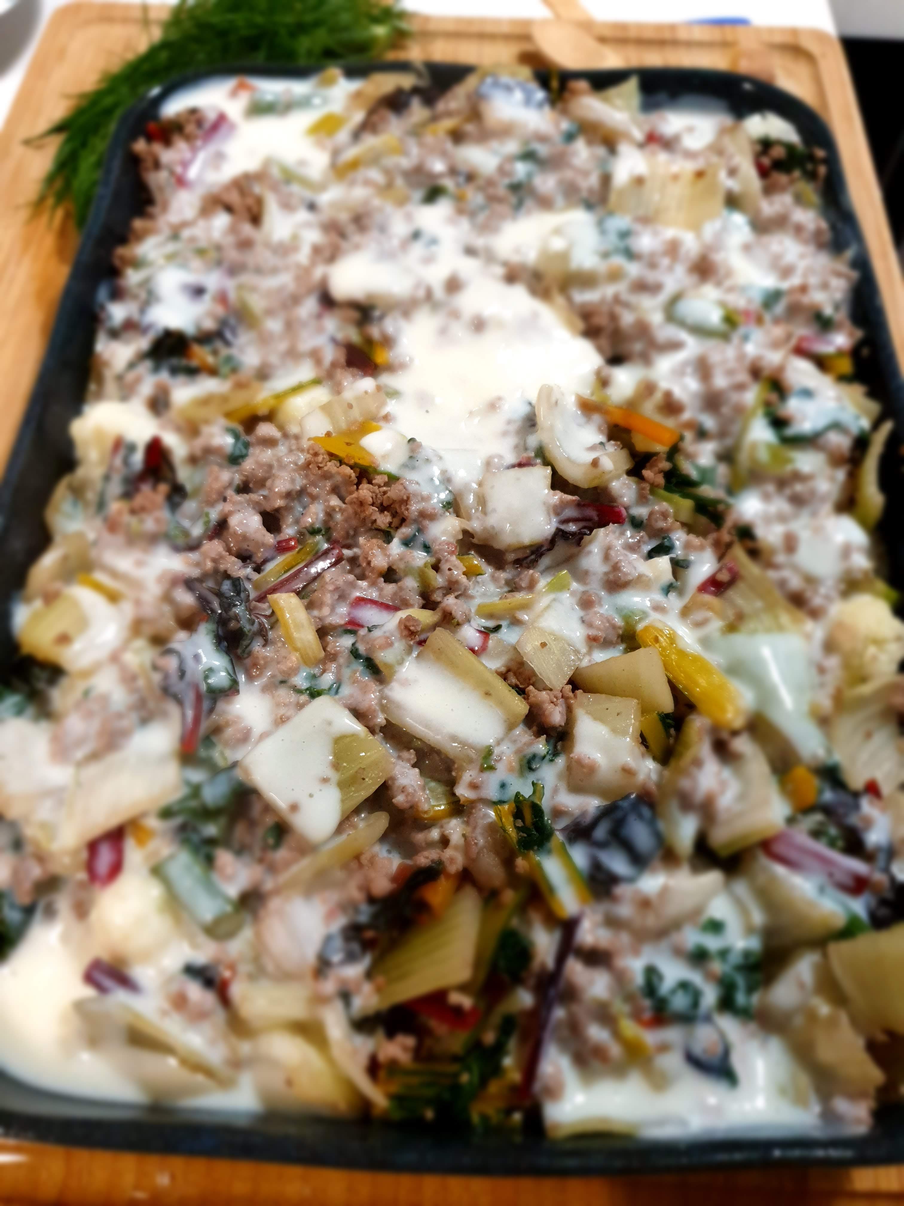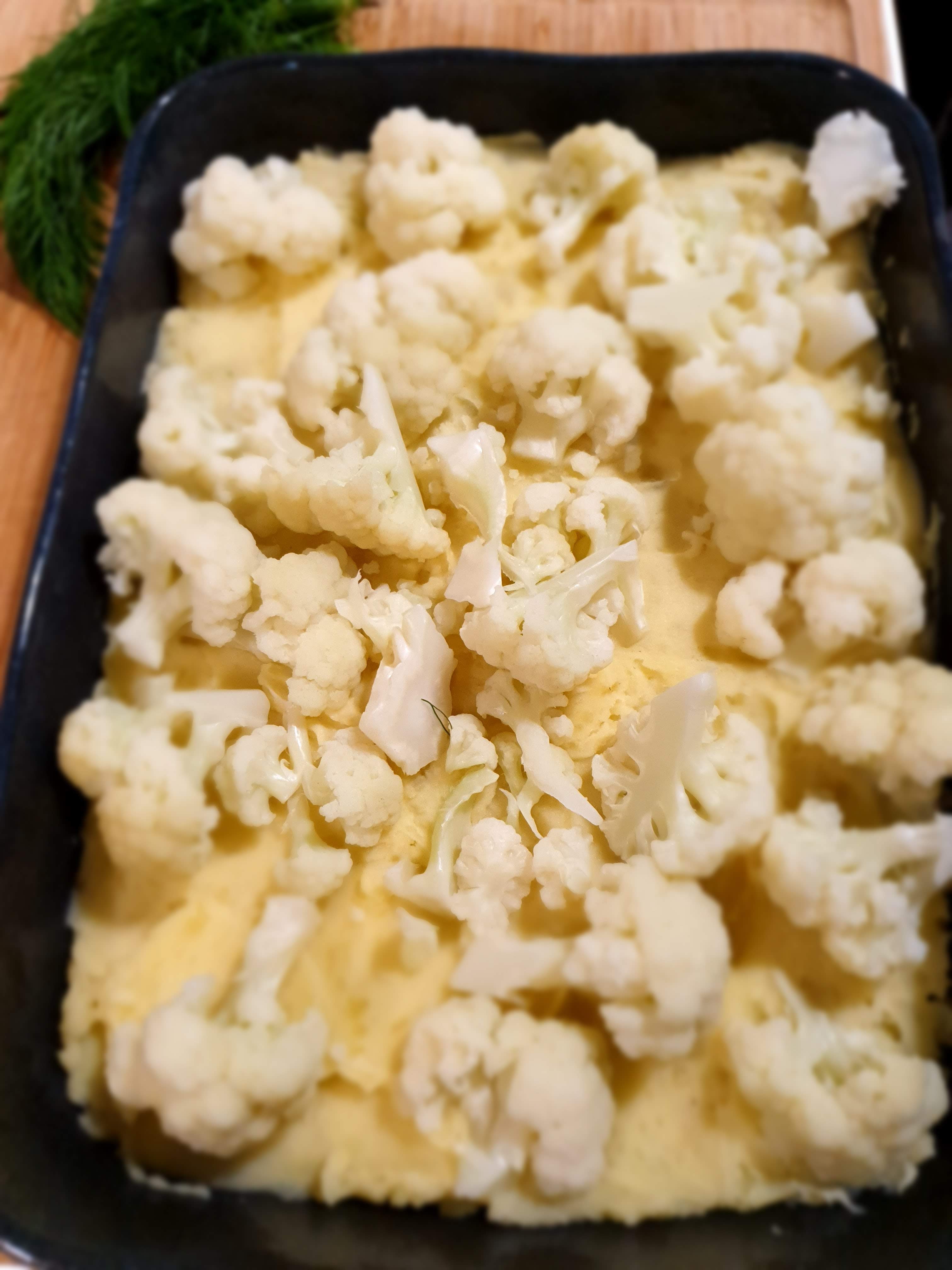 - オーブン用のプレートにジャガイモのピュレを敷きその上にカリフラワーを並べる。その上に3の野菜をのせ、その上に4のクリームソースを掛ける。最後にグラタン用チーズを上にのせて、180℃のオーブンで約20~30分、チーズに色がつくまで焼き上げる。