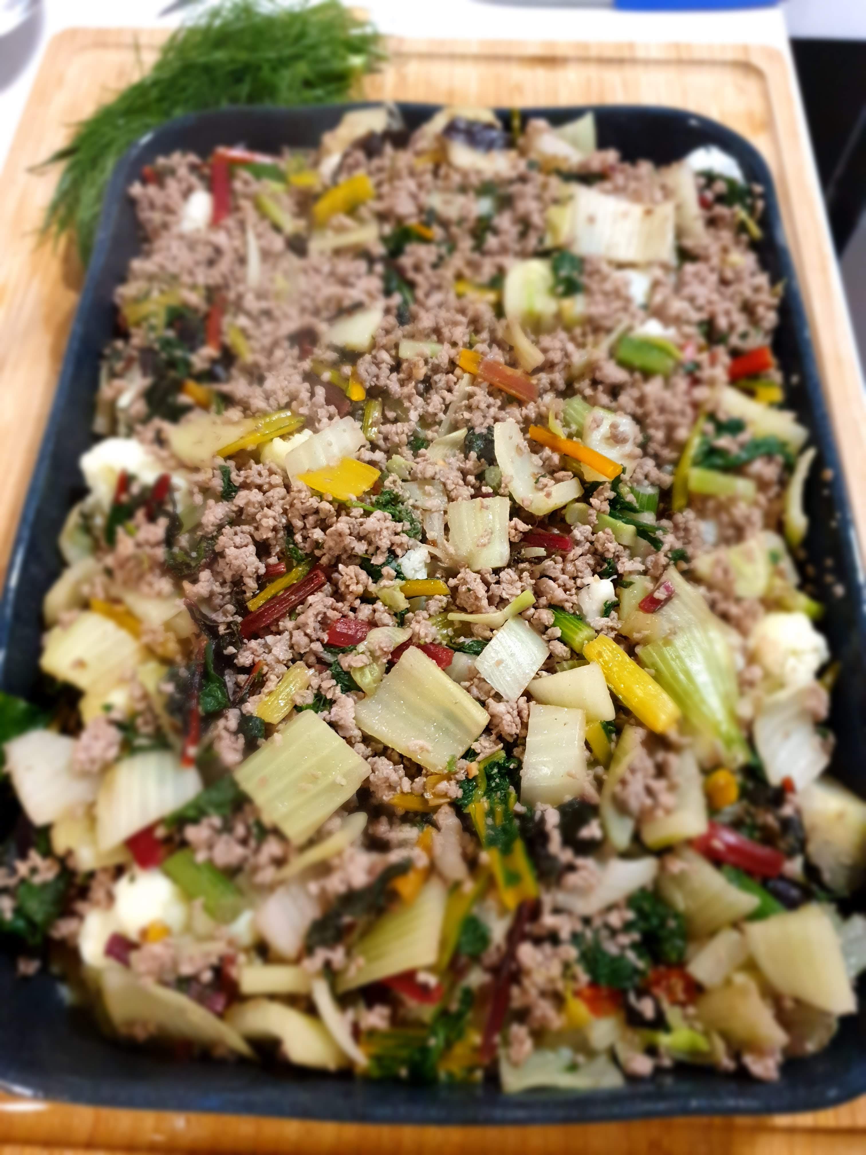 - フライパンに油大さじ1を温め、ひき肉を炒める。ひき肉の色が変わり始めたら、フェンネルとスイスチャードを加えて軽く3分ほど炒める。塩、胡椒とイタリアンハーブで味付けをする。