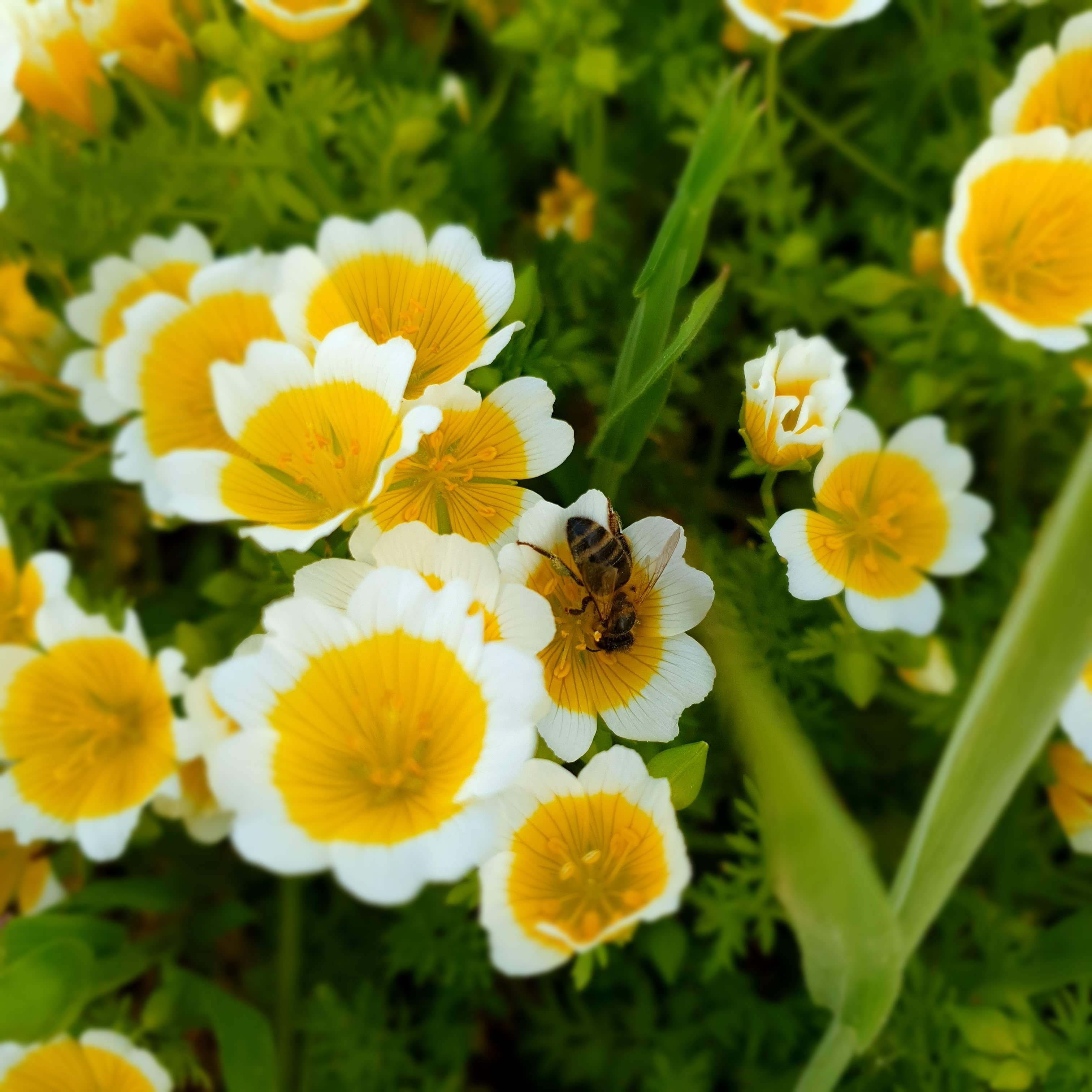 去年蒔いた花が一年草かと思いきや今年も綺麗に咲いています。ミツバチが大忙しで働いています。